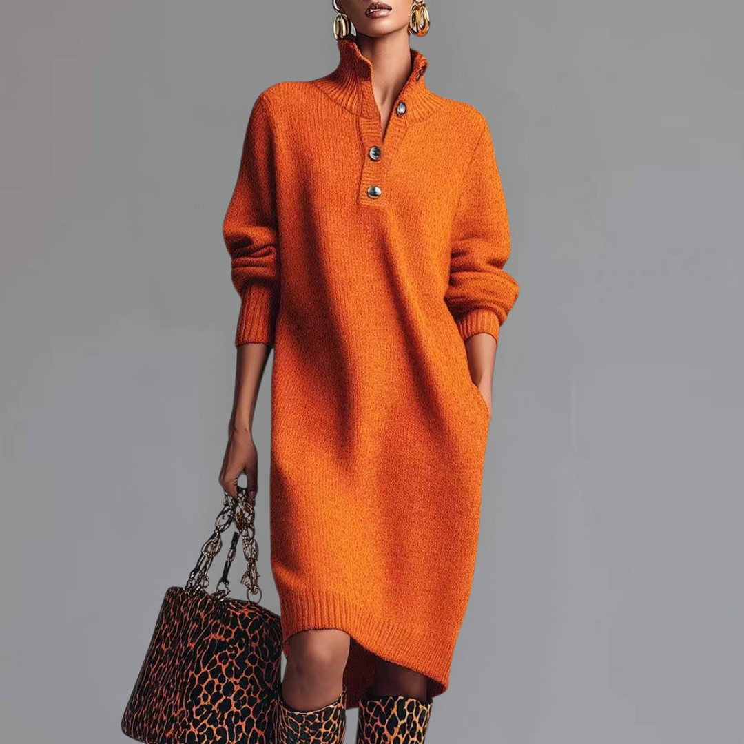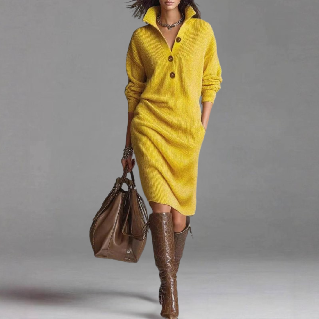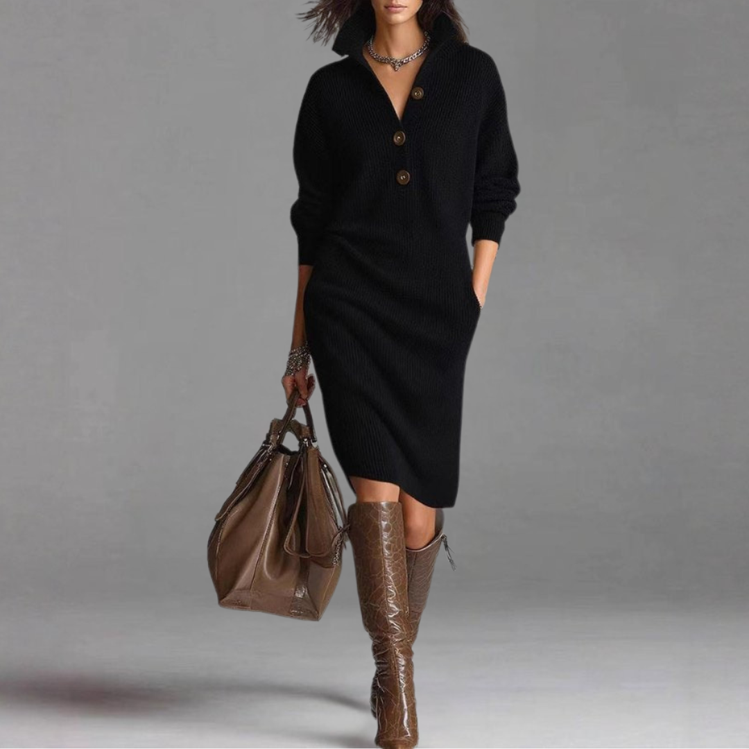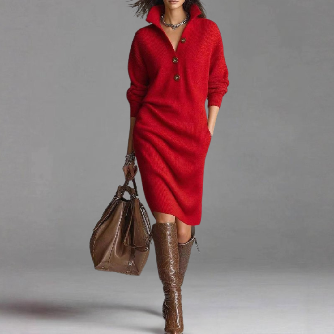 The Scarlett dress is the epitome of winter elegance, combining comfort and style. Made from soft knit fabric, it delicately hugs the figure while providing a cosy, warm feel. Its refined collar and decorative buttons add a touch of sophistication, ideal for chilly days. Whether at the office, at a party or just to feel beautiful every day, this versatile dress is perfect for any occasion.